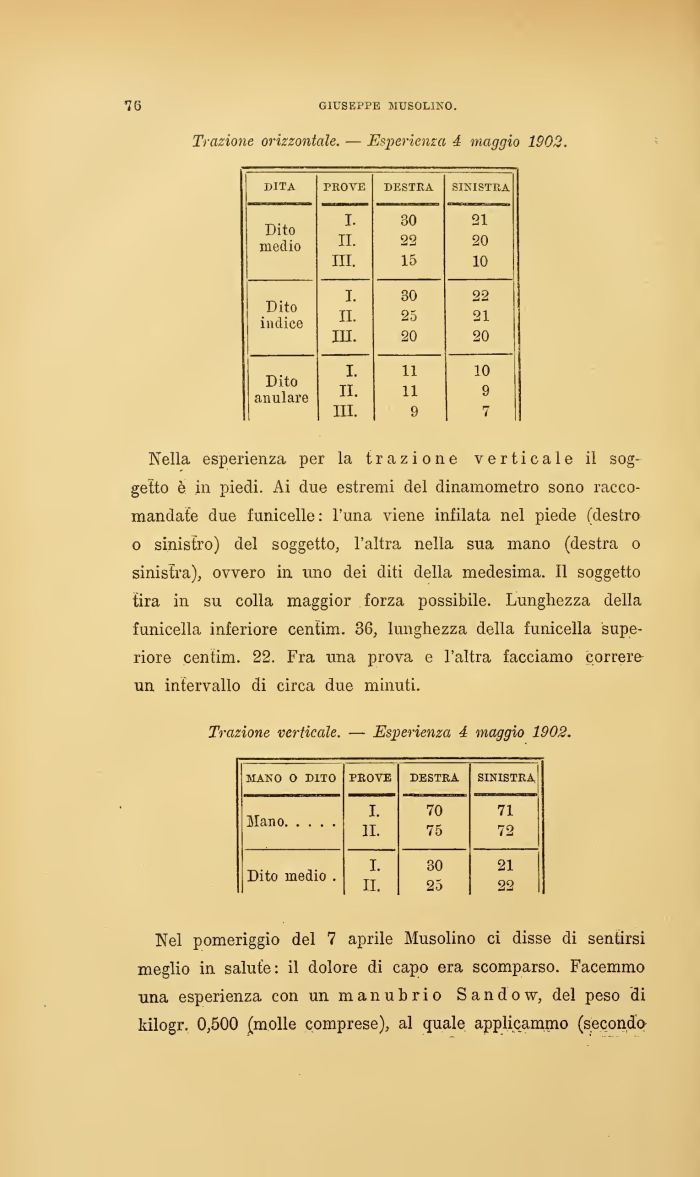 Nel pomeriggio del 7 aprile Musolino ci disse di sentirsi meglio in salute: il dolore di capo era scomparso. Facemmo una esperienza con un manubrio Sandow, del peso di kilogr. 0,500 (molle comprese), al quale applicammo (secondo