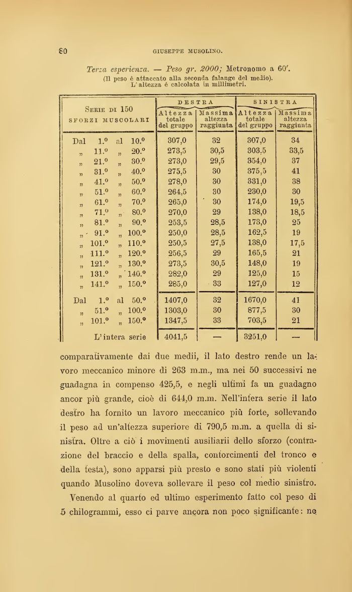 comparativamente dai due medii, il lato destro rende un la-; voro meccanico minore di 263 m.m., ma nei 50 successivi ne guadagna in compenso 425,5, e negli ultimi fa un guadagno ancor più grande, cioè di 644,0 m.m. Nell'intera serie il lato destro ha fornito un lavoro meccanico più forte, sollevando il peso ad un'altezza superiore di 790,5 m.m. a quella di sinistra. Oltre a ciò i movimenti ausiliarii dello sforzo (contrazione del braccio e della spalla, contorcimenti del tronco e della testa), sono apparsi più presto e sono stati più violenti quando Musolino doveva sollevare il peso col medio sinistro.