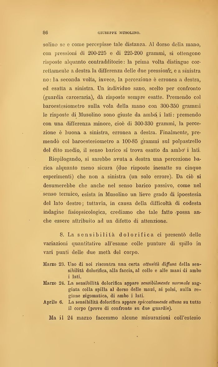 Marzo 24. La sensibilità dolorifica appare sensìbilmente normale saggiata colla spilla al dorso delle mani, ai polsi, sulla regione zigomatica, di ambo i lati. Aprile 6. La sensibilità dolorifica appare spiccatamente ottusa su tutto il corpo (prove di confronto su due guardie).
