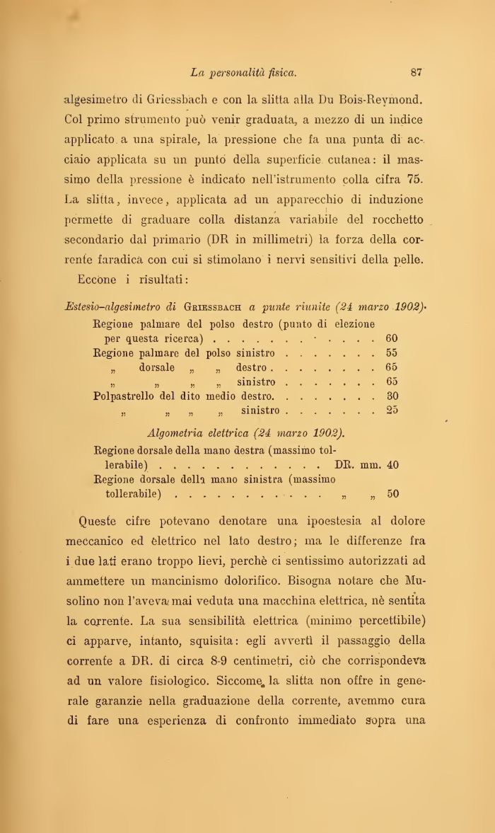 Algometria elettrica (24 marzo 1902). Regione dorsale della mano destra (massimo tollerabile) ............DR. mm. 40