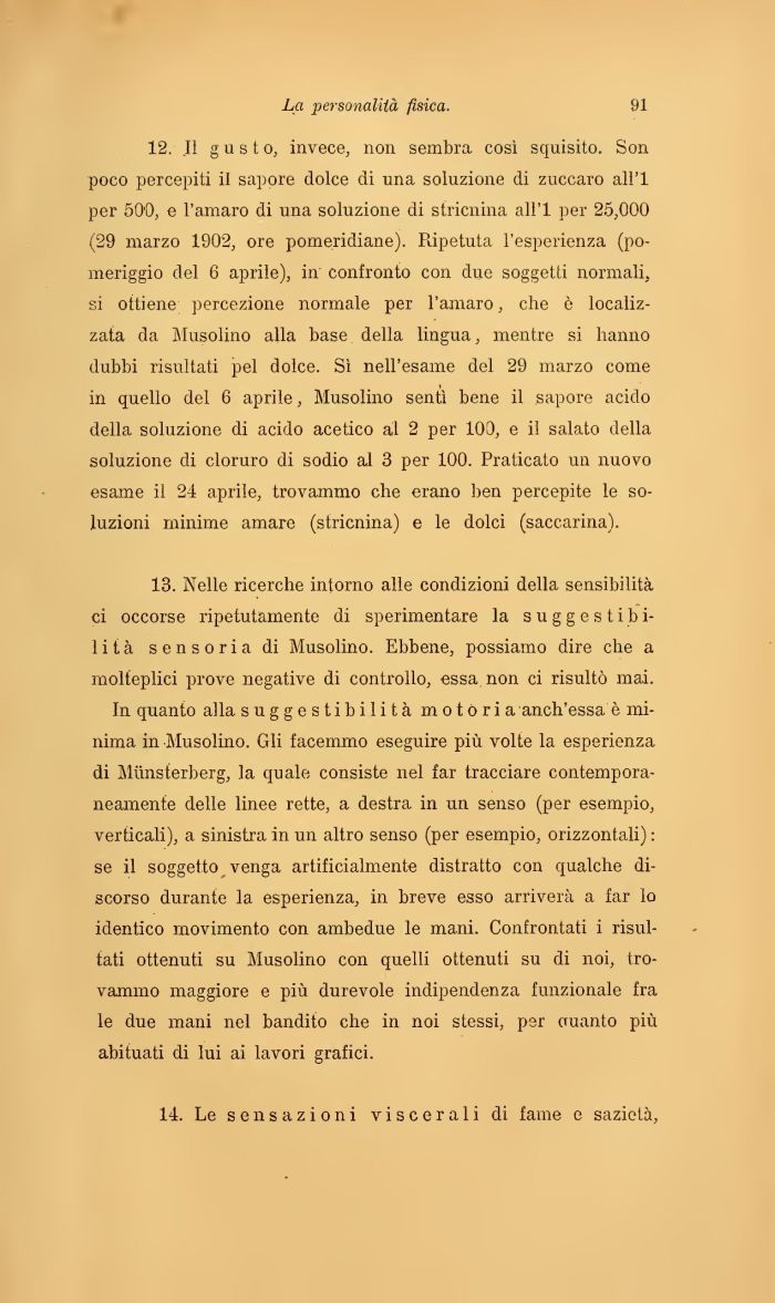 13. Nelle ricerche intorno alle condizioni della sensibilità ci occorse ripetutamente di sperimentare la suggestibilità sensoria di Musolino. Ebbene, possiamo dire che a molteplici prove negative di controllo, essa non ci risultò mai.