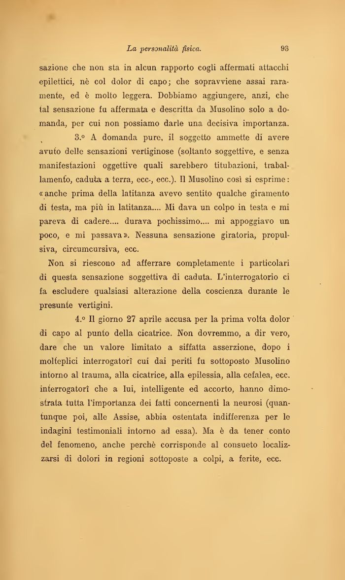 3.° A domanda pure, il soggetto ammette di avere avuto delle sensazioni vertiginose (soltanto soggettive, e senza manifestazioni oggettive quali sarebbero titubazioni, traballamelo, caduta a terra, ecc-, ecc.). Il Musolino così si esprime : «anche prima della latitanza avevo sentito qualche giramento di testa, ma più in latitanza.... Mi dava un colpo in testa e mi pareva di cadere.... durava pochissimo.... mi appoggiavo un poco, e mi passava». Nessuna sensazione giratoria, propulsiva, circumcursiva, ecc.