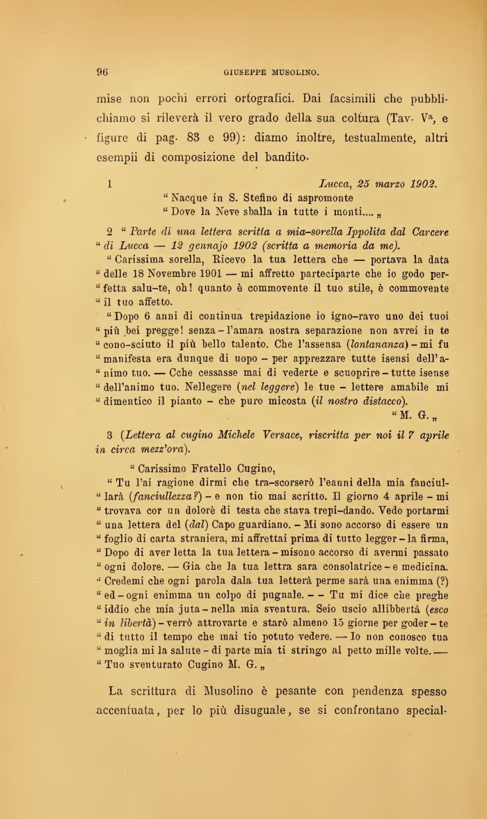 mise non pochi errori ortografici. Dai facsimili che pubblichiamo si rileverà il vero grado della sua coltura (Tav- Va, e figure di pag- 83 e 99) : diamo inoltre, testualmente, altri esempii di composizione del bandito-