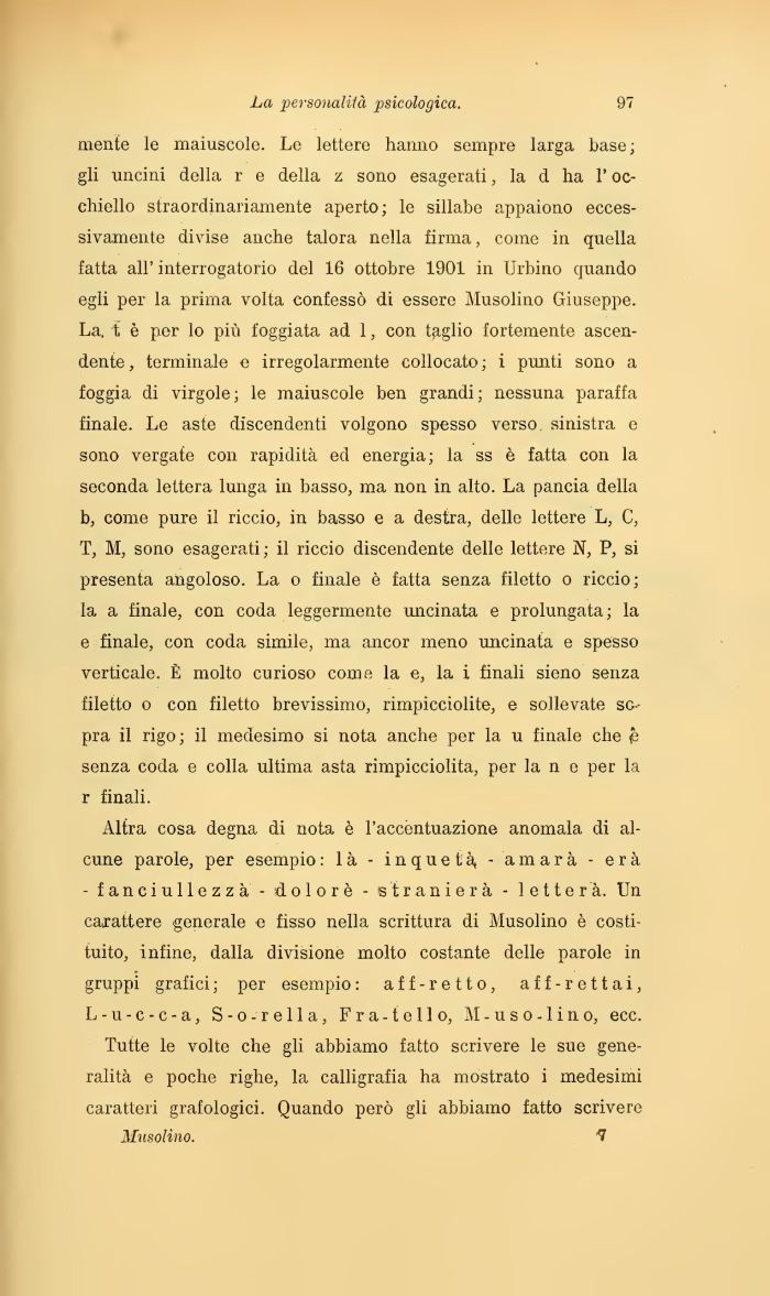 mente le maiuscole. Lo lettere hanno sempre larga base; gli uncini della r e della z sono esagerati, la d ha l'occhiello straordinariamente aperto; le sillabe appaiono eccessivamente divise anche talora nella firma, come in quella fatta all' interrogatorio del 16 ottobre 1901 in Urbino quando egli per la prima volta confessò di essere Musolino Giuseppe. La, t è per lo più foggiata ad 1, con taglio fortemente ascendente, terminale e irregolarmente collocato; i punti sono a foggia di virgole; le maiuscole ben grandi; nessuna paraffa finale. Le aste discendenti volgono spesso verso, sinistra e sono vergate con rapidità ed energia; la ss è fatta con la seconda lettera lunga in basso, ma non in alto. La pancia della b, come pure il riccio, in basso e a destra, delle lettere L, C, T, M, sono esagerati; il riccio discendente delle lettere N, P, si presenta angoloso. La o finale è fatta senza filetto o riccio; la a finale, con coda leggermente uncinata e prolungata; la e finale, con coda simile, ma ancor meno uncinata e spesso verticale. È molto curioso come la e, la i finali sieno senza filetto o con filetto brevissimo, rimpicciolite, e sollevate sopra il rigo; il medesimo si nota anche per la u finale che £ senza coda e colla ultima asta rimpicciolita, per la n e per la r finali.
