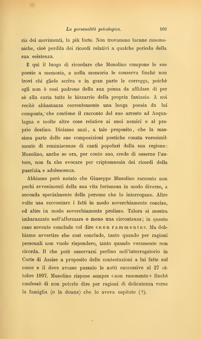 Abbiamo però notato che Giuseppe Musolino racconta non pochi avvenimenti della sua vita fortunosa in modo diverso, a seconda specialmente delle persone che lo interrogano. Altre volte usa raccontare i fatti in modo soverchiamente conciso, ed altre in modo soverchiamente prolisso. Talora si mostra imbarazzato nell'affermare o meno una circostanza; in questo caso sovente conclude col dire «non rammento». Ma dobbiamo avvertire che così conclude, tanto quando per ragioni personali non vuole rispondere, tanto quando veramente non ricorda. Il che potè osservarsi perfino nell'interrogatorio in Corte di Assise a proposito delle contestazioni a lui fatte sul come e il dove avesse passato le notti successive al 27 ottobre 1897. Musolino rispose sempre «non rammento» finché confessò di non poterlo dire per ragioni di delicatezza verso la famiglia (o la donna) che lo aveva ospitato (?).
