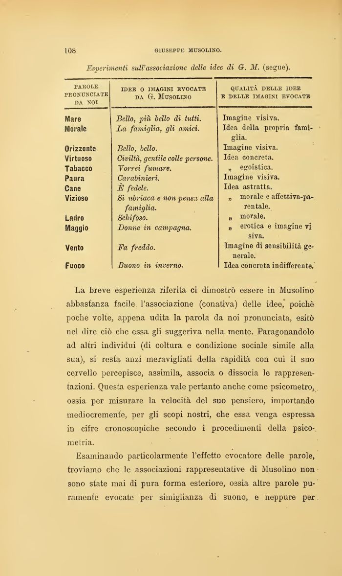 La breve esperienza riferita ci dimostrò essere in Musolino abbastanza facile, l'associazione (conativa) delle idee, poiché poche volte, appena udita la parola da noi pronunciata, esitò nel dire ciò che essa gli suggeriva nella mente. Paragonandolo ad altri individui (di coltura e condiziono sociale simile alla sua), si resta anzi meravigliati della rapidità con cui il suo cervello percepisce, assimila, associa o dissocia le rappresentazioni. Questa esperienza vale pertanto anche come psicometro, ossia per misurare la velocità del suo pensiero, importando mediocremente, per gli scopi nostri, che essa venga espressa in cifre cronoscopiche secondo i procedimenti della psico-, metria.