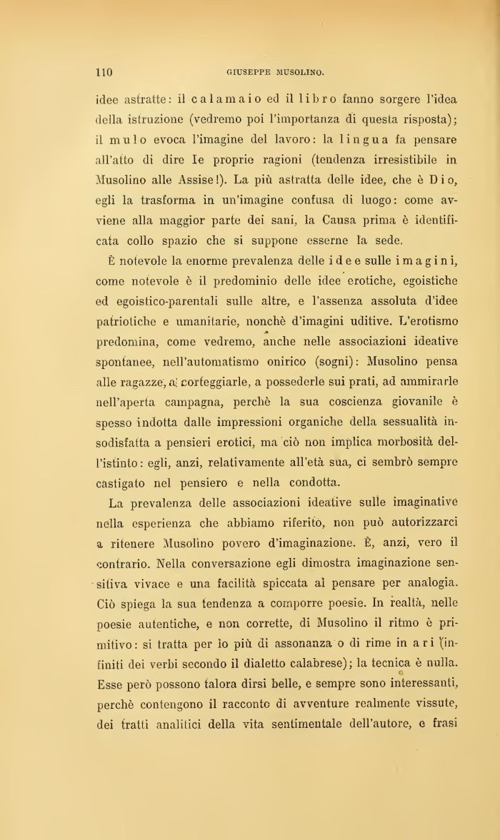 È notevole la enorme prevalenza delle idee sulle i m a g i n i, come notevole è il predominio delle idee erotiche, egoistiche ed egoistico-parentali sulle altre, e l'assenza assoluta d'idee patriotiche e umanitarie, nonché d'imagini uditive. L'erotismo predomina, come vedremo, anche nelle associazioni ideative spontanee, nell'automatismo onirico (sogni) : Musolino pensa alle ragazze, ai corteggiarle, a possederle sui prati, ad ammirarle nell'aperta campagna, perchè la sua coscienza giovanile è spesso indotta dalle impressioni organiche della sessualità insodisfatta a pensieri erotici, ma ciò non implica morbosità dell'istinto : egli, anzi, relativamente all'età sua, ci sembrò sempre castigato nel pensiero e nella condotta.