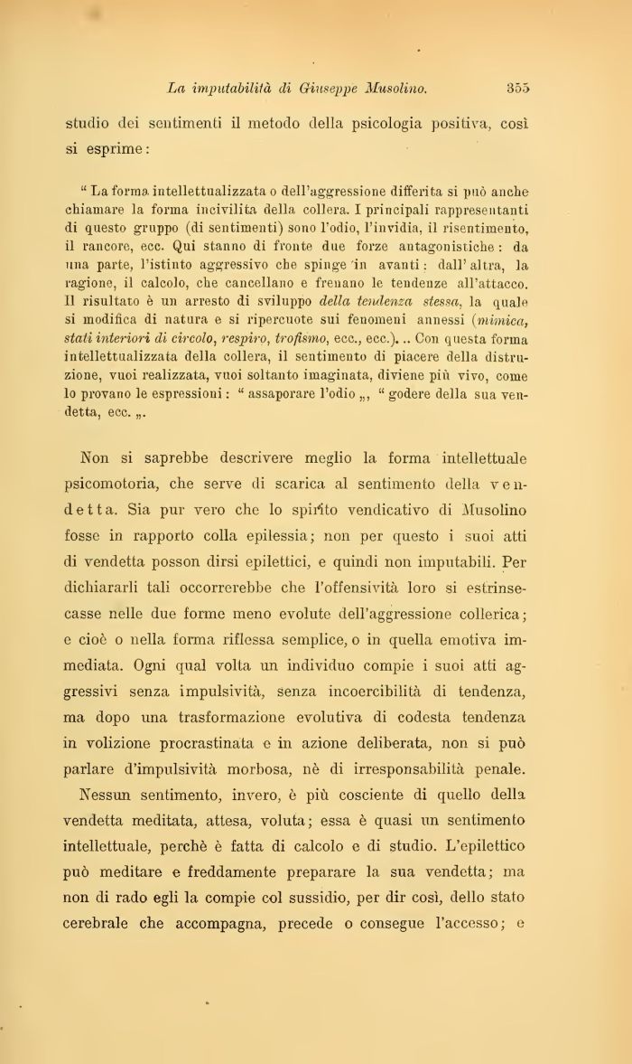 Non si saprebbe descrivere meglio la forma intellettuale psicomotoria, che serve di scarica al sentimento della v e n-detta. Sia pur vero che lo spirito vendicativo di Musolino fosse in rapporto colla epilessia; non per questo i suoi atti di vendetta posson dirsi epilettici, e quindi non imputabili. Per dichiararli tali occorrerebbe che l'offensività loro si estrinsecasse nelle due forme meno evolute dell'aggressione collerica; e cioè o nella forma riflessa semplice, o in quella emotiva immediata. Ogni qual volta un individuo compie i suoi atti aggressivi senza impulsività, senza incoercibilità di tendenza, ma dopo una trasformazione evolutiva di codesta tendenza in volizione procrastinata e in azione deliberata, non si può parlare d'impulsività morbosa, nè di irresponsabilità penale.