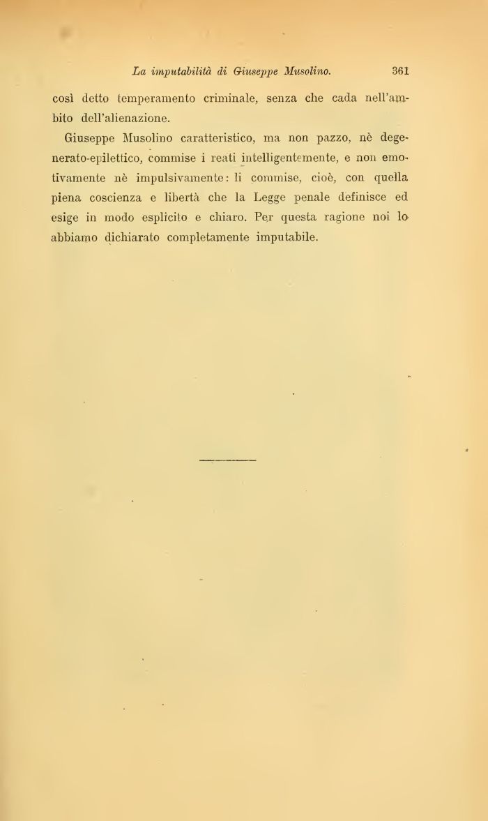 Giuseppe Musolino caratteristico, ma non pazzo, nò degenerato-epilettico, commise i reati intelligentemente, e non emotivamente nè impulsivamente : li commise, cioè, con quella piena coscienza e libertà che la Legge penale definisce ed esige in modo esplicito e chiaro. Pe,r questa ragione noi lo abbiamo dichiarato completamente imputabile.