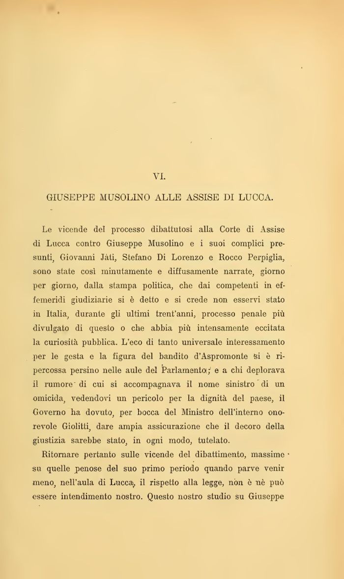 Le vicende del processo dibattutosi alla Corte di Assise di Lucca contro Giuseppe Musolino e i suoi complici presunti, Giovanni Jàti, Stefano Di Lorenzo e Rocco Perpiglia, sono state così minutamente e diffusamente narrate, giorno per giorno, dalla stampa politica, che dai competenti in effemeridi giudiziarie si è detto e si crede non esservi stato in Italia, durante gli ultimi trent'anni, processo penale più divulgato di questo o che abbia più intensamente eccitata la curiosità pubblica. L'eco di tanto universale interessamento per le gesta e la figura del bandito d'Aspromonte Si è ripercossa persino nelle aule del Parlamenta; e a chi deplorava il rumore' di cui si accompagnava il nome sinistro di un omicida, vedendovi un pericolo per la dignità del paese, il Governo ha dovuto, per bocca del Ministro dell'interno onorevole Giolitti, dare ampia assicurazione che il decoro della giustizia sarebbe stato, in ogni modo, tutelato.