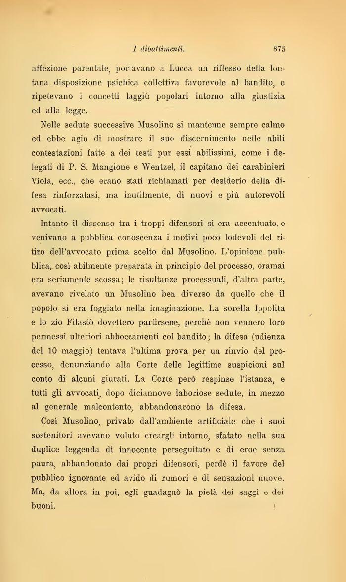 Così Musolino, privato dall'ambiente artificiale che i suoi sostenitori avevano voluto creargli intorno, sfatato nella sua duplice leggenda di innocente perseguitato e di eroe senza paura, abbandonato dai propri difensori, perdè il favore del pubblico ignorante ed avido di rumori e di sensazioni nuove. Ma, da allora in poi, egli guadagnò la pietà dei saggi e dei buoni. !