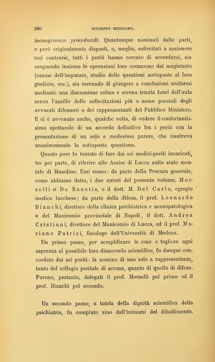 Questo pure fu tentato di fare dai sei medici-periti incaricati, tre per parte, di riferire alle Assise di Lucca sullo stato mentale di Musolino. Essi erano : da parte della Procura generale, come abbiamo detto, i due autori del presente volume, M o r-s e 11 i é D e S a n c t i s, e il dott. M. Del Carlo, egregio medico lucchese ; da parte della difesa, il prof. Leonardo Bianchi, direttore della clinica psichiatrica e neuropatologica e del Manicomio provinciale di Napoli, il dott. Andrea Cristiani, direttore del Manicomio di Lucca, ed il prof. Mariano Patrizi, fisiologo dell'Università di Modena.