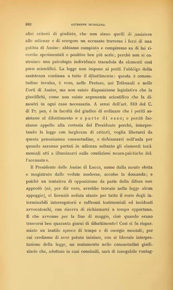 altri criterii di giudizio, che: non siano quelli di .assistere alle udienze e di scorgere un accusato traverso i ferri di una gabbia di Assise : abbiamo compiuto e compiremo su di lui ricerche sperimentali e positive ben più serie; perchè non si co-' struisce una psicologia individuale traendola da elementi così poco scientifici. La legge non impone ai periti l'obbligo della assistenza continua a tutto il dibattimento : questa, è consuetudine invalsa, è vero, nelle Preture, nei Tribunali e nelle Corti di Assise, ma non esiste disposizione legislativa che la giustifichi, come non esiste argomento scientifico che la dimostri in ogni caso necessaria. A sensi dell'art. 310 del C. di Pr. pen. è in facoltà del giudice di ordinare che i periti assistano al dibattimento o a parte di esso; e perciò facciamo appello alla cortesia del Presidente perchè, interpretando la legge con larghezza di criterii, voglia liberarci da questa penosissima consuetudine, e richiamarci nell'aula per quando saranno portati in udienza soltanto gli elementi testimoniali atti a illuminarci sulle condizioni neuro-psichiche dell'accusato ».