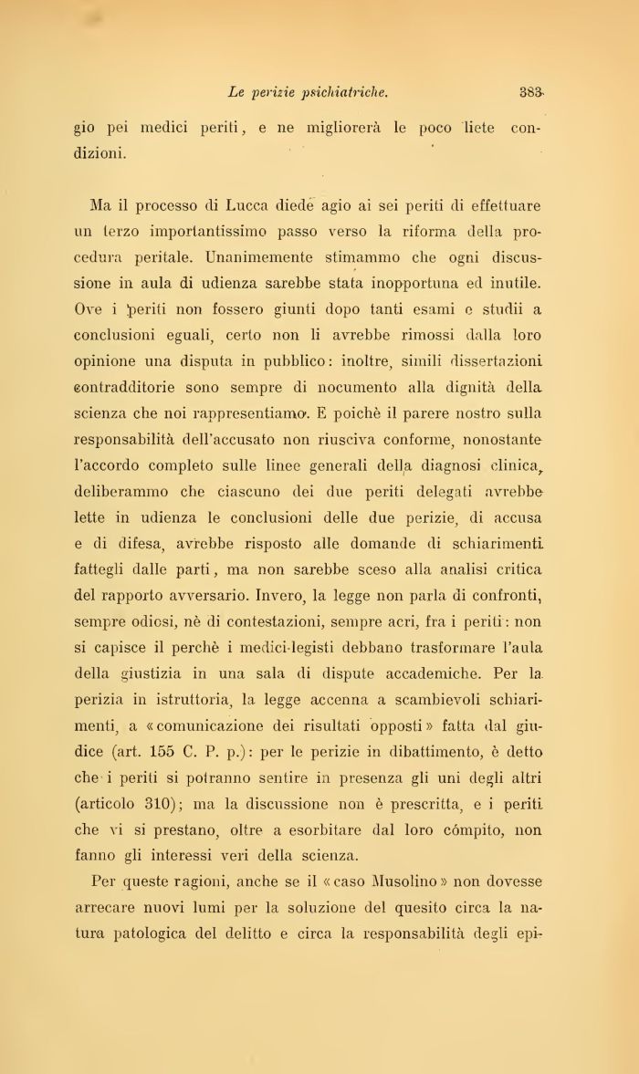 Ma il processo di Lucca diede agio ai sei periti eli effettuare un terzo importantissimo passo verso la riforma della procedura peritale. Unanimemente stimammo che ogni discussione in aula di udienza sarebbe stata inopportuna ed inutile. Ove i periti non fossero giunti dopo tanti esami e studii a conclusioni eguali, certo non li avrebbe rimossi dalla loro opinione una disputa in pubblico: inoltre, simili dissertazioni contradditorie sono sempre di nocumento alla dignità della scienza che noi rappresentiamo'. E poiché il parere nostro sulla responsabilità dell'accusato non riusciva conforme, nonostante l'accordo completo sulle linee generali della diagnosi clinica, deliberammo che ciascuno dei due periti delegati avrebbe lette in udienza le conclusioni delle due perizie, di accusa e di difesa, avrebbe risposto alle domande di schiarimenti fattegli dalle parti, ma non sarebbe sceso alla analisi critica del rapporto avversario. Invero, la legge non parla di confronti, sempre odiosi, nè di contestazioni, sempre acri, fra i periti : non si capisce il perchè i medici-legisti debbano trasformare l'aula della giustizia in una sala di dispute accademiche. Per la. perizia in istruttoria, la. legge accenna a scambievoli schiarimenti, a « comunicazione dei risultati opposti » fatta dal giudice (art. 155 C. P. p.) : per le perizie in dibattimento, è detto che i periti si potranno sentire in presenza gli uni degli altri (articolo 310); ma la discussione non è prescritta, e i periti che vi si prestano, oltre a esorbitare dal loro compito, non fanno gli interessi veri della scienza.