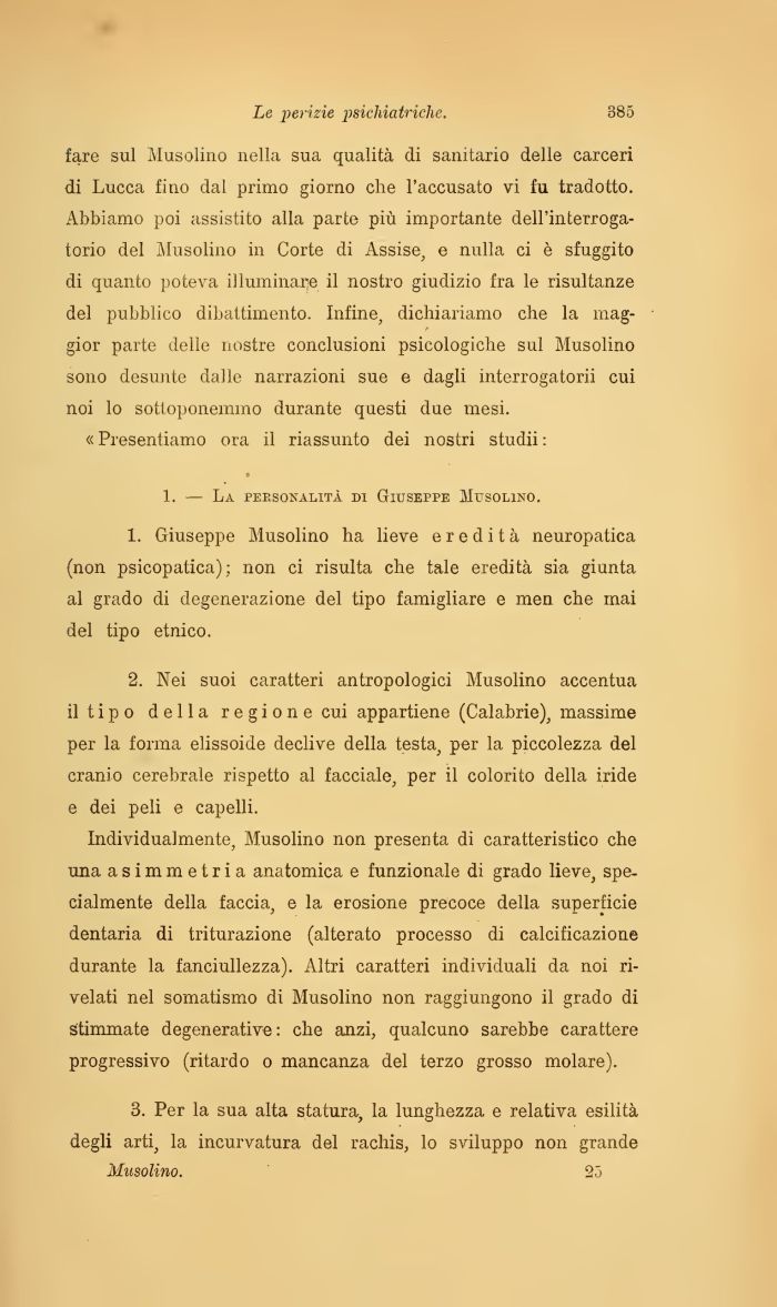 1. Giuseppe Musolino ha lieve eredità neuropatica (non psicopatica); non ci risulta che tale eredità sia giunta al grado di degenerazione del tipo famigliare e men che mai del tipo etnico.