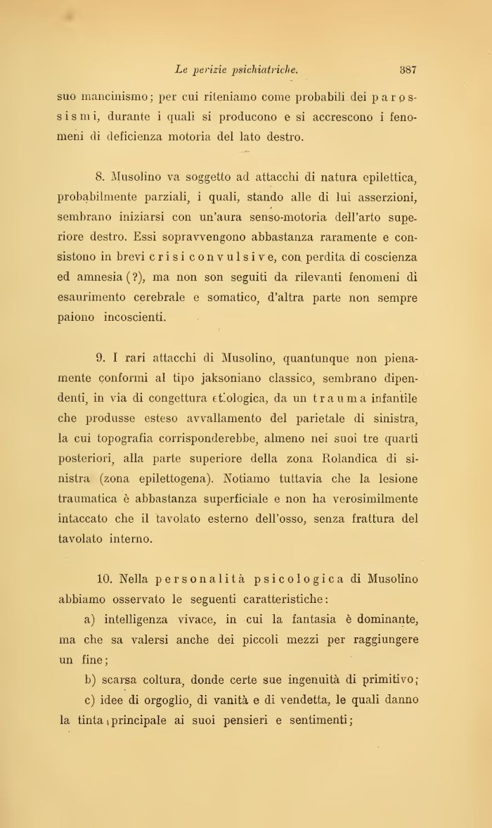 8. Musolino va soggetto ad attacchi di natura epilettica, probabilmente parziali, i quali, stando alle di lui asserzioni, sembrano iniziarsi con un'aura senso-motoria dell'arto superiore destro. Essi sopravvengono abbastanza raramente e consistono in brevi crisi convulsive, con perdita di coscienza ed amnesia ( ?), ma non son seguiti da rilevanti fenomeni di esaurimento cerebrale e somatico, d'altra parte non sempre paiono incoscienti.