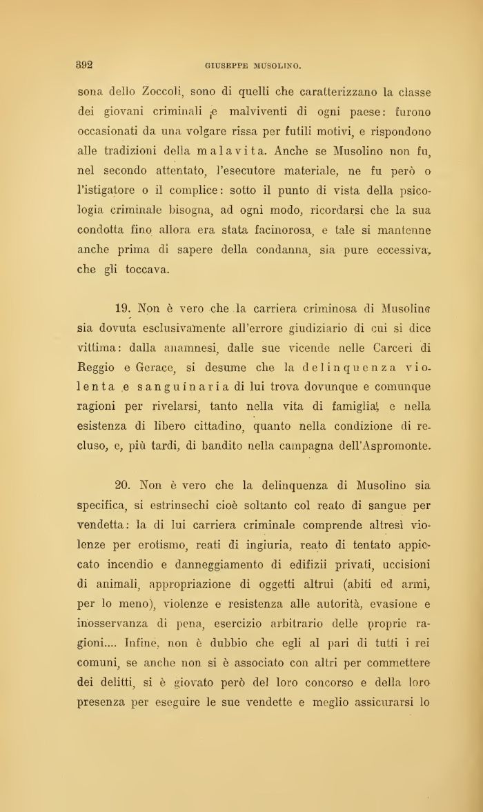 sona dello Zoccoli, sono di quelli che caratterizzano la classe dei giovani criminali fe malviventi di ogni paese: furono occasionati da una volgare rissa per futili motivi, e rispondono alle tradizioni della malavita. Anche se Musolino non fu, nel secondo attentato, l'esecutore materiale, ne fu però o l'istigatore o il complice: sotto il punto di vista della psicologia criminale bisogna, ad ogni modo, ricordarsi che la sua condotta fino allora era stata facinorosa, e tale si mantenne anche prima di sapere della condanna, sia pure eccessiva, che gli toccava.