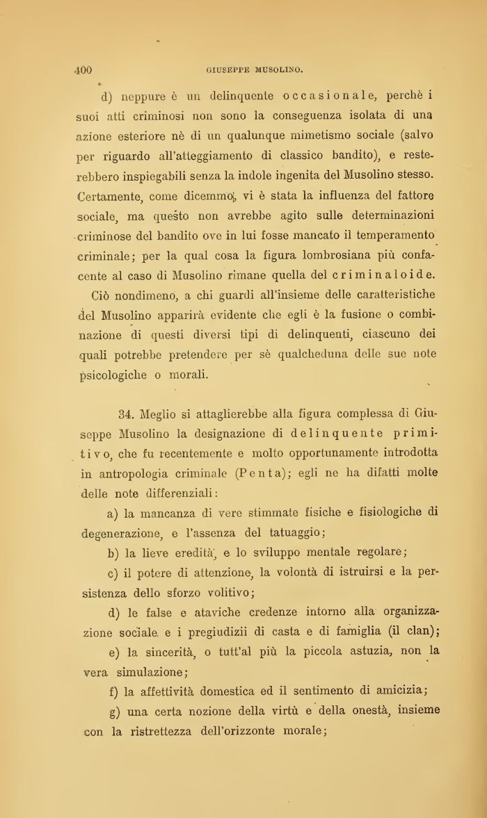 34. Meglio si attaglierebbe alla figura complessa di Giuseppe Musolino la designazione di delinquente primitivo, che fu recentemente e molto opportunamente introdotta in antropologia criminale (Penta); egli ne ha difatti molte delle note differenziali :