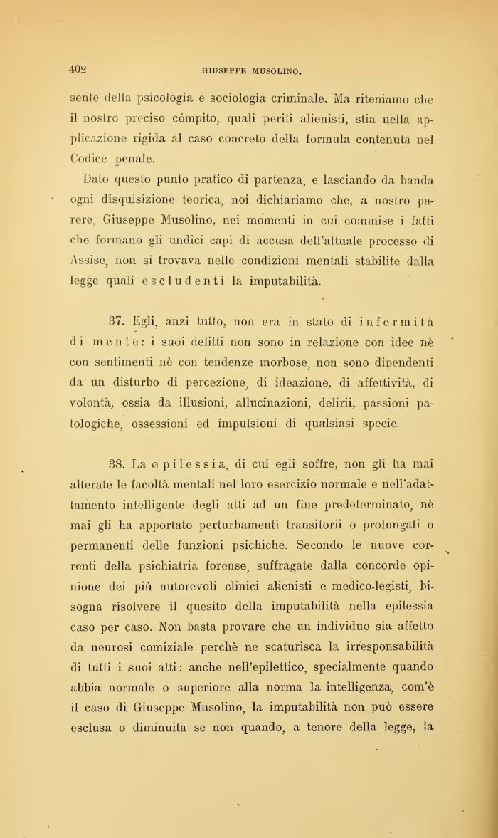 Dato questo punto pratico di partenza, e lasciando da banda ogni disquisizione teorica, noi dichiariamo che, a nostro parere, Giuseppe Musolino, nei momenti in cui commise i fatti che formano gli undici capi di accusa dell'attuale processo di Assise, non si trovava nelle condizioni mentali stabilite dalla legge quali escludenti la imputabilità.