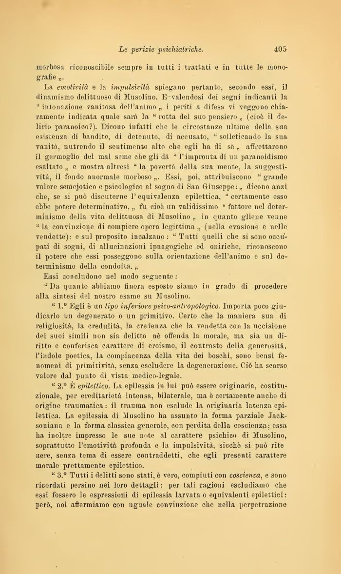 1.° Egli è un tipo inferiore psico-antropologico. Importa poco giudicarlo un degenerato o un primitivo. Certo che la maniera sua di religiosità, la credulità, la credenza che la vendetta con la uccisione dei suoi simili non sia delitto nè offenda la morale, ma sia un diritto e conferisca carattere di eroismo, il contrasto della generosità, l'indole poetica, la compiacenza della vita dei boschi, sono bensì fenomeni di primitività, senza escludere la degenerazione. Ciò ha scarso valore dal punto di vista medico-legale.