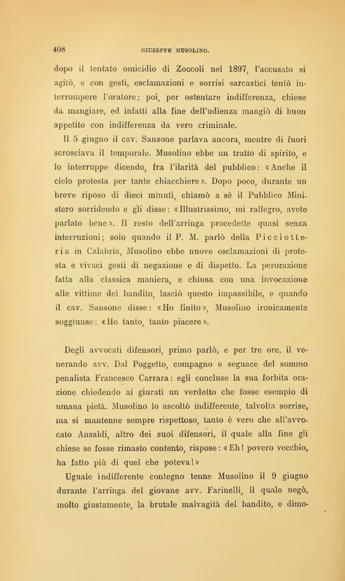 Uguale indifferente contegno tenne Musolino il 9 giugno durante l'arringa del giovane avv. Farinelli, il quale negò, molto giustamente, la brutale malvagità del bandito, e dimo-