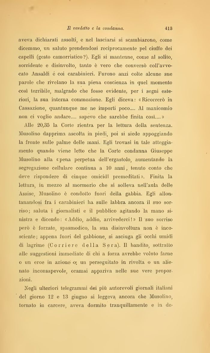 aveva dichiarati assolti, e nel lasciarsi si scambiarono, come dicemmo, un saluto prendendosi reciprocamente pel ciuffo dei capelli (gesto camorristico ?). Egli si mantenne, come al solito, sorridente e disinvolto, tanto è vero che conversò coll'avvo-cato Ansaldi é coi carabinieri. Furono anzi colte alcune sue parole che rivelano la sua piena coscienza in quel momento così terribile, malgrado che fosse evidente, per i segni esteriori, la sua interna commozione. Egli diceva : « Ricorrerò in Cassazione, quantunque me ne importi poco.... Al manicomio non ci voglio andare.... sapevo che sarebbe finita così.... »