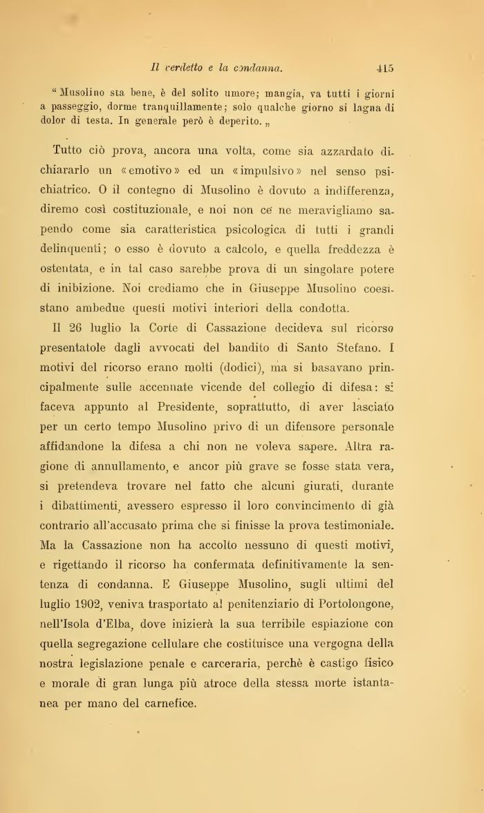 II 26 luglio la Corte di Cassazione decideva sul ricorso presentatole dagli avvocati del bandito di Santo Stefano. I motivi del ricorso erano molti (dodici), ma si basavano principalmente sulle accennate vicende del collegio di difesa : si faceva appunto al Presidente, soprattutto, di aver lasciato per un certo tempo Musolino privo di un difensore personale affidandone la difesa a chi non ne voleva sapere. Altra ragione di annullamento, e ancor più grave se fosse stata vera, si pretendeva trovare nel fatto che alcuni giurati, durante i dibattimenti, avessero espresso il loro convincimento di già contrario all'accusato prima che si finisse la prova testimoniale. Ma la Cassazione non ha accolto nessuno di questi motivi, e rigettando il ricorso ha confermata definitivamente la sentenza di condanna. E Giuseppe Musolino, sugli ultimi del luglio 1902, veniva trasportato a! penitenziario di Portolongone, nell'Isola d'Elba, dove inizierà la sua terribile espiazione con quella segregazione cellulare che costituisce una vergogna della nostra legislazione penale e carceraria, perchè è castigo fisico e morale di gran lunga più atroce della stessa morte istantanea per mano del carnefice.