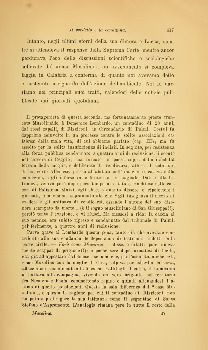 Il protagonista di questa seconda, ma fortunatamente presto troncata Musolineide, è Domenico Lombardo, un contadino di 28 anni, dai rossi capelli, di Rizziconi, in Circondario di Palmi. Costui fu dapprima coinvolto in un processo contro le solite associazioni calabresi della mala vita, di cui abbiamo parlato (cap. Ili) ; ma fu assolto per la solita insufficienza di indizii. In seguito, per resistenza alla forza pubblica condannato a quattro anni di reclusione, li scontò nel carcere di Reggio ; ma tornato in paese seppe della infedeltà forzata della moglie, e deliberato di vendicarsi, attese il seduttore di lei, certo Albanese, presso all'abitato nell'ora che rincasava dalla campagna, e gli inferse varie ferite con un pugnale. Datosi alla latitanza, veniva però dopo poco tempo arrestato e rinchiuso nelle carceri di Polistena. Quivi, egli ebbe, a quanto dissero e ripetettero i giornali, una visione soprannaturale che gli insegnava il mezzo di evadere e gli ordinava di vendicarsi, essendo 1' autore del suo disonore scampato da morte „ (è il sogno musoliniano di San Giuseppe!!): perciò tentò 1' evasione, e vi riuscì. Ma messosi a ridar la caccia al suo nemico, era subito ripreso e condannato dal tribunale di Palmi, pel ferimento, a quattro anni di reclusione.