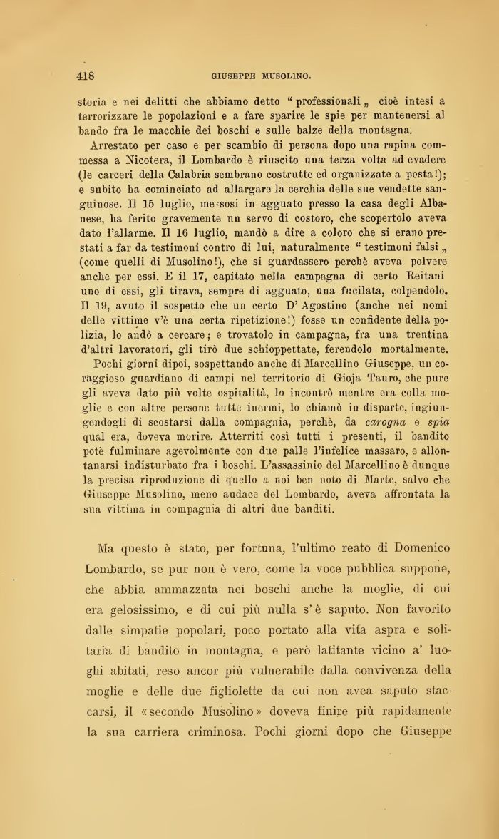 Pochi giorni dipoi, sospettando anche di Marcellino Giuseppe, un coraggioso guardiano di campi nel territorio di Gioja Tauro, che pure gli aveva dato più volte ospitalità, lo incontrò mentre era colla moglie e con altre persone tutte inermi, lo chiamò in disparte, ingiungendogli di scostarsi dalla compagnia, perchè, da carogna e spia qual era, doveva morire. Atterriti così tutti i presenti, il bandito potè fulminare agevolmente con due palle l'infelice massaro, e allontanarsi indisturbato fra i boschi. L'assassinio del Marcellino è dunque la precisa riproduzione di quello a noi ben noto di Marte, salvo che Giuseppe Musolino, meno audace del Lombardo, aveva affrontata la sua vittima in compagnia di altri due banditi.