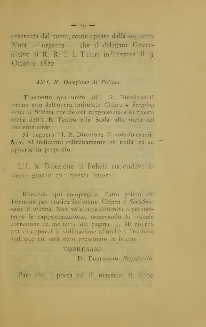 Rimando qui compiegato Tutto primo del Dramma per musica intitolato Chiara e Sera/ina. ossia il Pirata. Non ho alcuna difficoltà a permetterne la rappresentazione, osservando la piccola correzione da me fatta alla pagina <>. Mi riserbo poi di apporvi la vidimazione allorché il Dramma suddetto mi sarà stato presentato in intero.