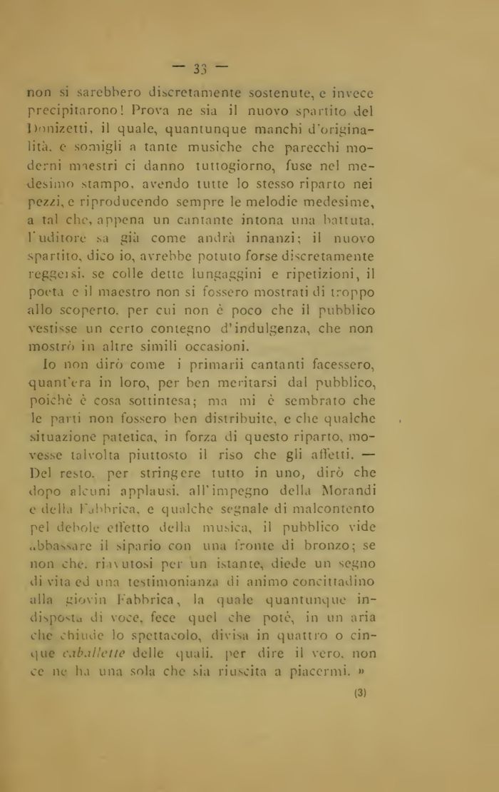 Io non dirò come i primarii cantanti facessero, quant'era in loro, per ben meritarsi dal pubblico, poiché è cosa sottintesa; ma mi è sembrato che le parti non fossero ben distribuite, e che qualche situazione patetica, in forza di questo riparto, movesse talvolta piuttosto il riso che gli affetti. — Del resto, per stringere tutto in uno, dirò che dopo alcuni applausi, all'impegno della Morandi e della Fabbrica, e qualche segnale di malcontento pel debole effetto della musica, il pubblico vide ..bbassare il sipario con una fronte di bronzo; se non che. rinuto.si per un istante, diede un segno di vita ed una testimonianza di animo concittadino alla giovili Fabbrica, la quale quantunque indisposta di voce, fece quel che potè, in un aria che chiude lo spettacolo, divisa in quattro o cinque cabaliate delle quali, per dire il vero, non ce ne ha una sola che sia riuscita a piacermi. »
