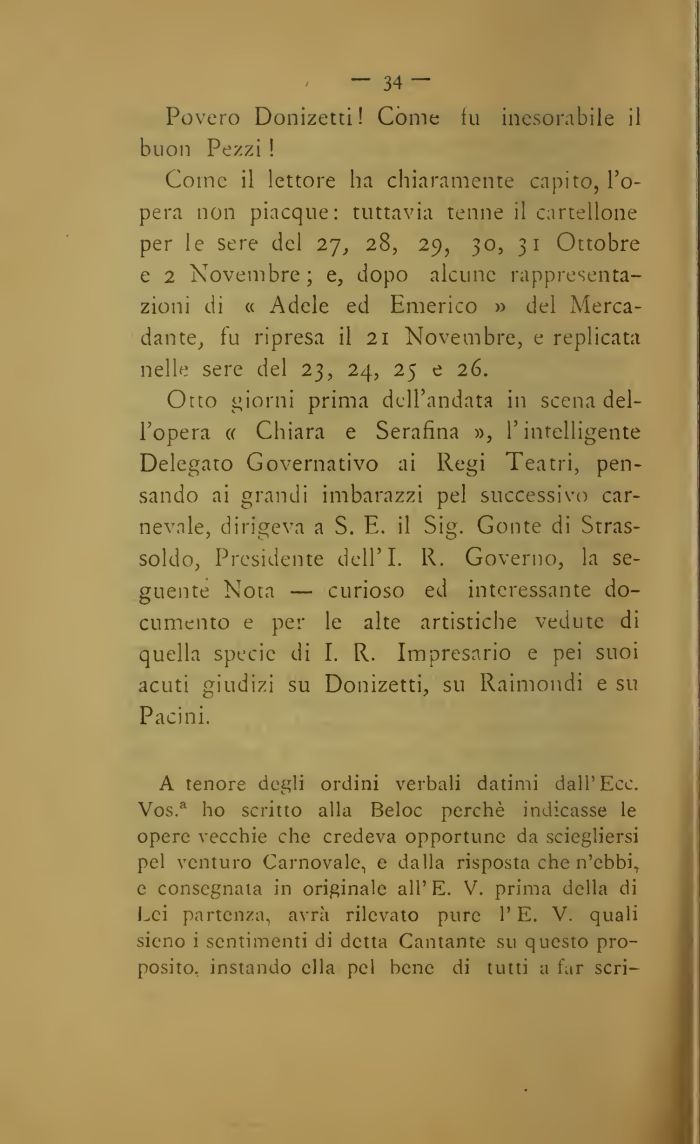 Otto giorni prima dell'andata in scena dell'opera « Chiara e Serafina », l'intelligente Delegato Governativo ai Regi Teatri, pensando ai grandi imbarazzi pel successivo carnevale, dirigeva a S. E. il Sig. Gonte di Stras-soldo, Presidente dell'I. R. Governo, la seguente Nota — curioso ed interessante documento e per le alte artistiche vedute di quella specie di I. R. Impresario e pei suoi acuti giudizi su Donizetti, su Raimondi e su Pacini.