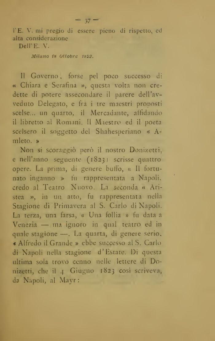 Non si scoraggiò però il nostro Donizetti. e nell'anno seguente (1823) scrisse quattro opere. La prima, di genere buffo, « Il fortunato inganno » fu rappresentata a Napoli, credo al Teatro Nuovo. La seconda « Aristea », in un atto, fu rappresentata nella Stagione di Primavera al S. Carlo di Napoli. La terza, una farsa, « Una follia » fu data a Venezia — ma ignoro in qual teatro ed in quale stagione —. La quarta, di genere serio, «Alfredo il Grande » ebbe successo al S. Carlo di Napoli nella stagione d'listate. Di questa ultima sola trovo cenno nelle lettere di Donizetti, che il 4 Giugno 1S23 cosi scriveva, do Napoli, al Mavr: