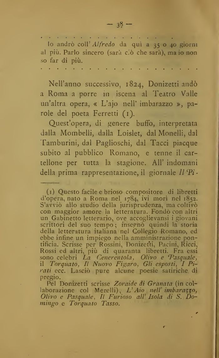 Nell'anno successivo, 1824, Donizetti andò a Roma a porre in iscena al Teatro Valle un'altra opera, « L'ajo nell' imbarazzo », parole del poeta Ferretti (1).