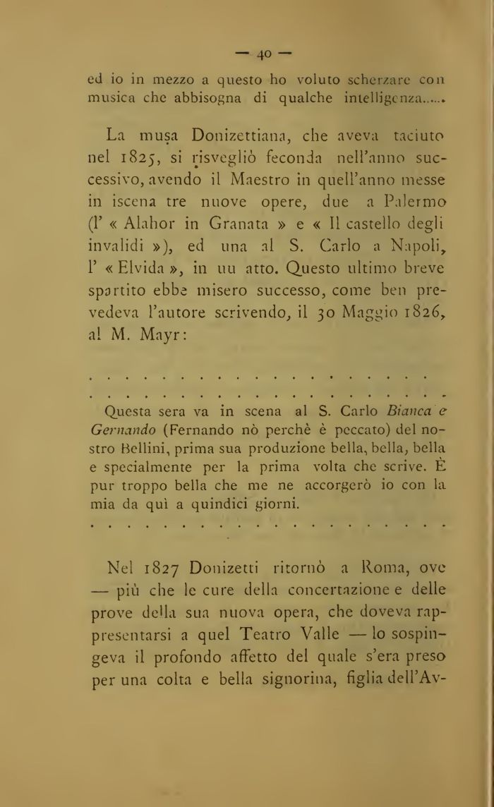 La musa Donizettiana, che aveva taciuto nel 1825, si risvegliò feconda nell'anno successivo, avendo il Maestro in quell'anno messe in iscena tre nuove opere, due a Palermo (1' « Alahor in Granata » e « Il castello degli invalidi »), ed una al S. Carlo a Napoli, P « Elvida », in liti atto. Questo ultimo breve spartito ebbe misero successo, come ben prevedeva l'autore scrivendo, il 30 Maggio 1826, al M. Mayr :