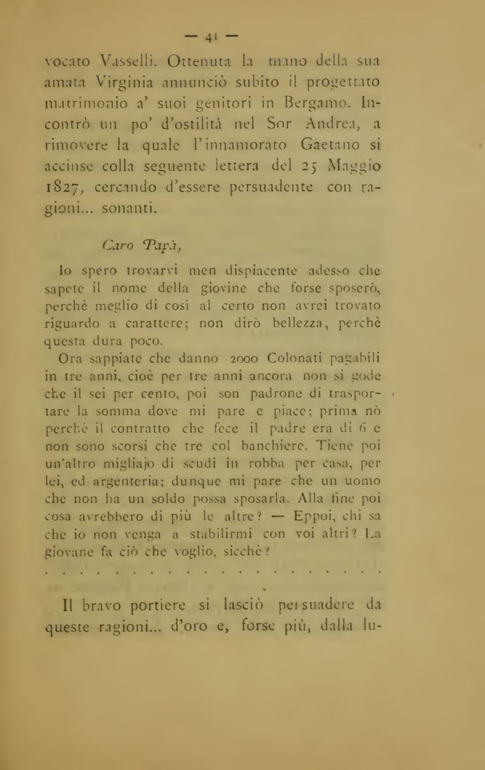 vocato Vassalli. Ottenuta la tìi.mo della sua amata Virginia annunciò subito il progettato matrimonio a' suoi genitori in Bergamo. Incontrò un po' d'ostilità nel Sor Andrea, a rimovere la quale l'innamorato Gaetano si accinse colla seguente lettera del 25 Maggio 1S27, cercando d'essere persuadente con ragioni... sonanti.