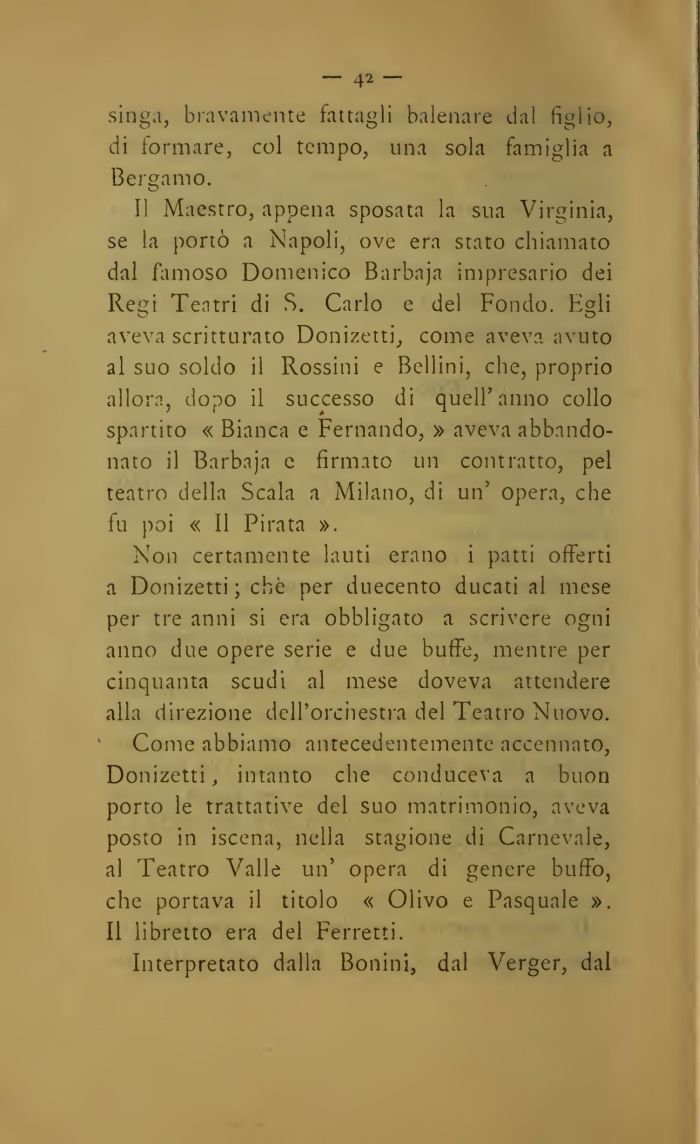 Il Maestro, appena sposata la sua Virginia, se la porṭ a Napoli, ove era stato chiamato dal famoso Domenico Barbaja impresario dei Regi Teatri di S. Carlo e del Fondo. Figli aveva scritturato Donizetti, come aveva avuto al suo soldo il Rossini e Bellini, che, proprio allora, dopo il successo di quell'anno collo spartito « Bianca e Fernando, » aveva abbandonato il Barbaja e firmato un contratto, pel teatro della Scala a Milano, di un' opera, che fu poi « Il Pirata ».