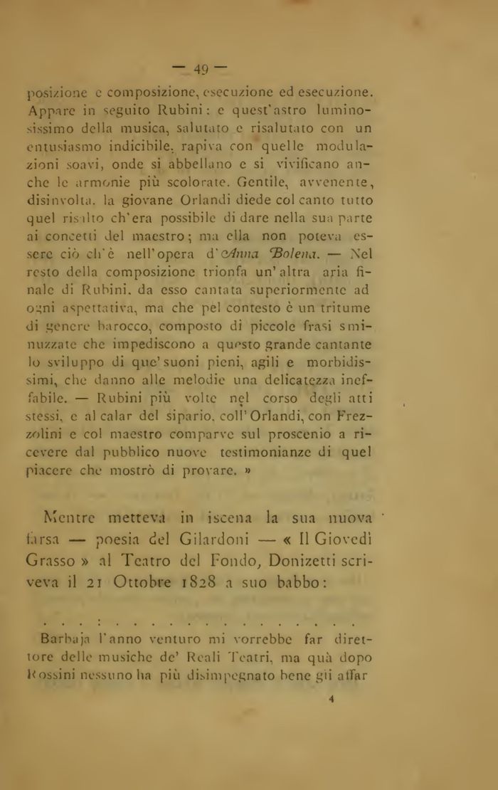 posizione e composizione, esecuzione ed esecuzione. Appare in seguito Rubini: e quest'astro luminosissimo della musica, salutato e risalutato con un entusiasmo indicibile, rapiva con quelle modulazioni soavi, onde si abbellano e si vivificano anche le armonie più scolorate. Gentile, avvenente, disinvolta, la giovane Orlandi diede col canto tutto quel risilto ch'era possibile di dare nella sua parte ai concetti del maestro; ma ella non poteva essere ciò cli'è nell'opera d'cAnna 'Boleiu. — Nel resto della composizione trionfa un'altra aria finale di Rubini, da esso cantata superiormente ad onni aspettativa, ma che pel contesto è un tritume di genere barocco, composto di piccole frasi sminuzzate che impediscono a questo grande cantante lo sviluppo di quo'suoni pieni, agili e morbidissimi, che danno alle melodie una delicatezza ineffabile. — Rubini più volte nel corso degli atti stessi, e al calar del sipario, coli'Orlandi, con Frez-zolini e col maestro comparve sul proscenio a ricevere dal pubblico nuove testimonianze di quel piacere che mostrò di provare. »