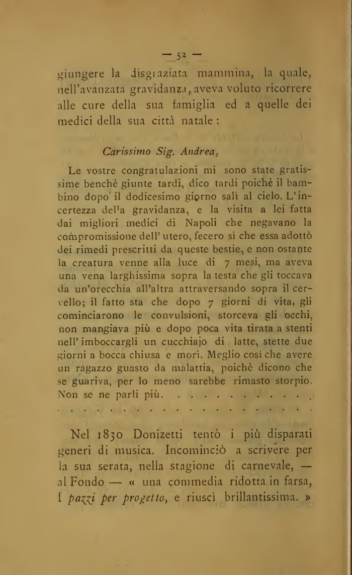 Le vostre congratulazioni mi sono state gratis-sime benché giunte tardi, dico tardi poiché il bambino dopo'il dodicesimo giprno salì al cielo. L'incertezza del'a gravidanza, e la visita a lei fatta dai migliori medici di Napoli che negavano la compromissione dell' utero, fecero sì che essa adottò dei rimedi prescritti da queste bestie, e non ostante la creatura venne alla luce di 7 mesi, ma aveva una vena larghissima sopra la testa che gli toccava da un'orecchia all'altra attraversando sopra il cervello; il fatto sta che dopo 7 giorni di vita, gli cominciarono le convulsioni, storceva gli occhi, non mangiava più e dopo poca vita tirata a stenti nell' imboccargli un cucchiaio di latte, stette due giorni a bocca chiusa e mori. Meglio cosi che avere un ragazzo guasto da malattia, poiché dicono che se guariva, per lo meno sarebbe rimasto storpio. Non se ne parli più...........
