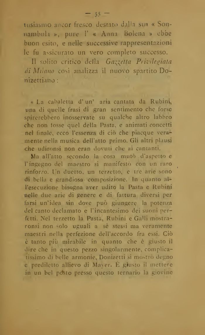 Ma all'atto secondo la cosa mutò d'aspetto e l'ingegno del maestro si manifestò con un raro rinforzo, In duetto, un terzetto, e tre arie sono di bella e grandiosa composizione. In quanto all'esecuzione bisogna aver udito la Pasta e Rubini nelle due arie di genere e di fattura diversi per farsi un'idea sin dove può giungere la potenza del canto declamato e l'incantesimo dei suoni perfetti. Nel terzetto la Pasta, Rubini e GaMi mostra-ronsi non solo uguali a sè stessi ma veramente maestri nella perfezione dell'accordo fra essi. Ciò e tanto più mirabile in quanto che e giusto il dire che in questo pezzo singolarmente, complicatissimo di belle armonie, Donizetti si mostrò degno e prediletto allievo di Ma\er. IC giusto il mettere in un bel petsto presso questo ternario la giovine