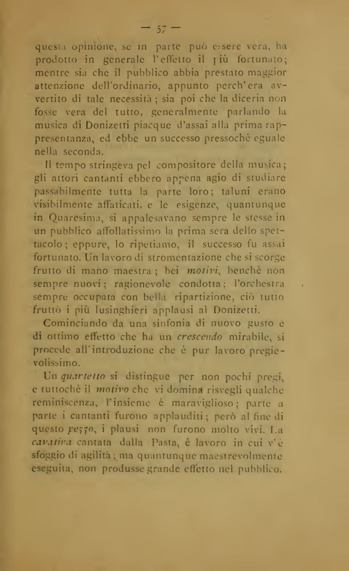 questa opinione, se in parte può c.~sere vera, ha prodotto in generale l'effetto il [iù fortunato; mentre sia che il pubblico abbia prestato maggior attenzione dell'ordinario, appunto perch'era avvertito di tale necessità ; sia poi che la diceria non fosse vera del tutto, generalmente parlando la musica di Donizetti piacque d'assai alla prima rappresentanza, ed ebbe un successo pressoché eguale nella seconda.