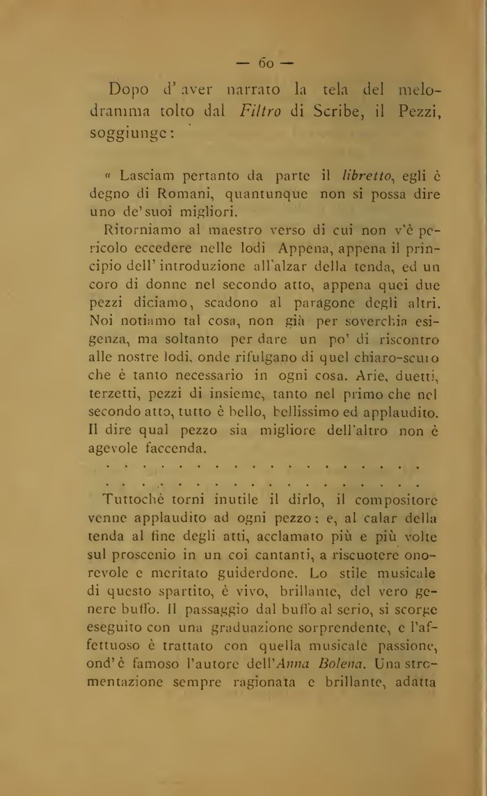 Dopo d' aver narrato la tela del melodramma tolto dal Filtro di Scribe, il Pezzi, soggiunge :
