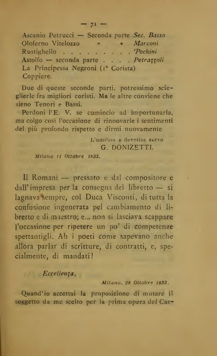 Il Romani — pressato e dal compositore e dall'impresa perla consegna del libretto— si lagnava tempre, col Duca Visconti, di tutta la confusione ingenerata pel cambiamento di libretto e di miestro; e... non si lasciava scappare l'occasione per ripetere un po' di competenze spettantigli. Ah i poeti come sapevano anche allora parlar di scritture, di contratti, e, specialmente, di mandati !