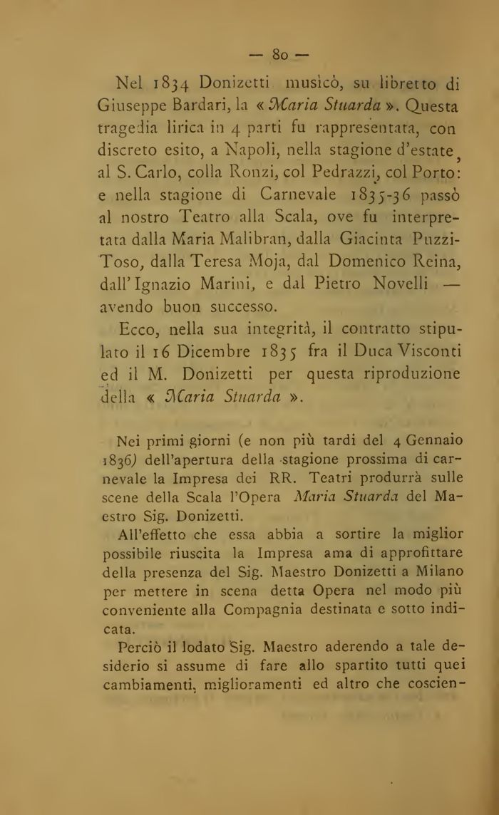 Ecco, nella sua integrità, il contratto stipulato il 16 Dicembre 1835 fra il Duca Visconti ed il M. Donizetti per questa riproduzione della « jìCaria Stuarda ».