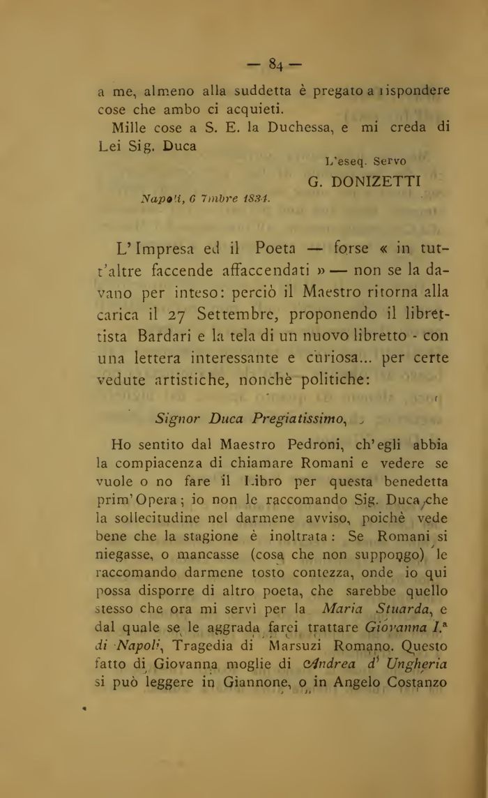 Ho sentito dal Maestro Pedroni, ch'egli abbia la compiacenza di chiamare Romani e vedere se vuole o no fare il Libro per questa benedetta prim'Opera; io non le raccomando Sig. Duca^che la sollecitudine nel darmene avviso, poiché vede bene che la stagione è inoltrata : Se Romani si niegasse, o mancasse (cosa che non suppongo) le raccomando darmene tosto contezza, onde io qui possa disporre di altro poeta, che sarebbe quello stesso che ora mi servì per la Maria Stuarda, e dal quale se le aggrada farei trattare Giovanna 7.a di Napoli, Tragedia di Marsuzi Romano. Questo fatto di Giovanna moglie di c/Jndrea di Ungheria si può leggere in Giannone, o in Angelo Costanzo