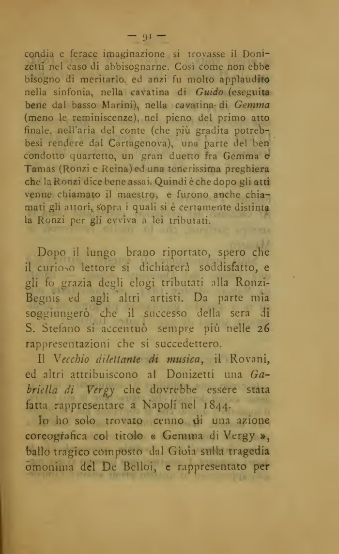 condia e ferace imaginazione si trovasse il Donizetti nel caso di abbisognarne. Cosi come non ebbe bisogno di meritarlo, ed anzi fu molto applaudito nella sinfonia, nella cavatina di Guido (eseguita bene dal basso Marini), nella cavatina-di Gemma (meno le reminiscenze), nel pieno dei primo atto finale, nell'aria del conte (che più gradita potreb-besi rendere dal Cartagenova), una parte del ben condotto quartetto, un gran duetto fra Gemma e Tamas (Ronzi e Reina) ed una tenerissima preghiera che la Ronzi dice bene assaii Quindi è che dopo gli atti venne chiamato il maestro, e furono anche chiamati gli attori, s'opra i quali si è certamente distinta la Ronzi per gli evviva a lei tributati.