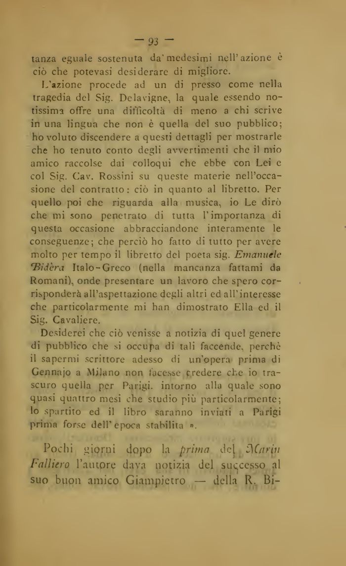 L'azione procede ad un di presso come nella tragedia del Sig. Delavigne, la quale essendo notissima offre una difficoltà di meno a chi scrive in una lingua che non è quella del suo pubblico; ho voluto discendere a questi dettagli per mostrarle che ho tenuto conto degli avvertimenti che il mio amico raccolse dai colloqui che ebbe con Lei e col Sig. Cav. Rossini su queste materie nell'occasione del contratto: ciò in quanto al libretto. Per quello poi che riguarda alla musica, io Le dirò che mi sono penetrato di tutta l'importanza di questa occasione abbracciandone interamente le conseguenze; che perciò ho fatto di tutto per avere molto per tempo il libretto del poeta sig. Emanuele 'Bidèra Italo-Greco (nella mancanza fattami da Romani), onde presentare un lavoro che spero corrisponderà all'aspettazione degli altri ed all'interesse che particolarmente mi han dimostrato Ella ed il Sig. Cavaliere.