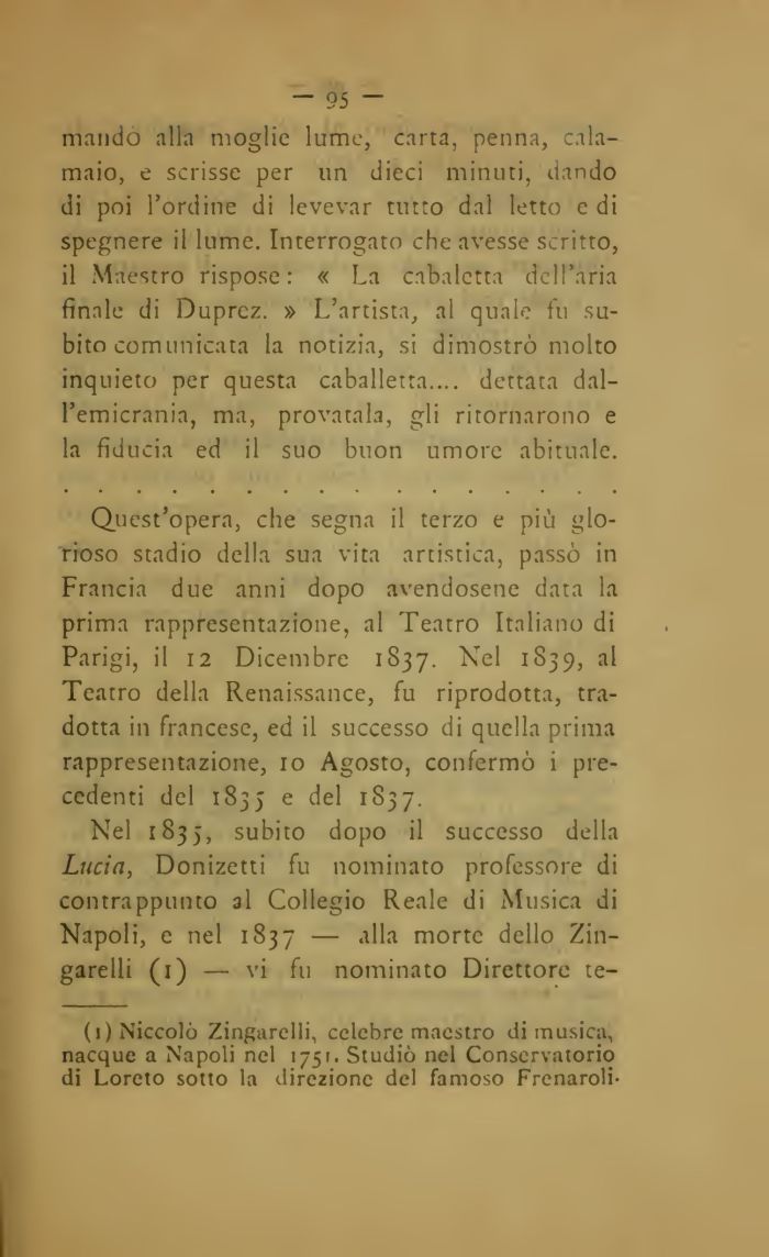 Nel 1835, subito dopo il successo della Lucia, Donizetti fu nominato professore di contrappunto al Collegio Reale di Musica di Napoli, e nel 1837 — alla morte dello Zin-garelli (1) — vi fu nominato Direttore reti) Niccolò Zingarelli, celebre maestro di musica, nacque a Napoli nel 1751. Studiò nel Conservatorio di Loreto sotto la direzione del famoso Frenaroli-