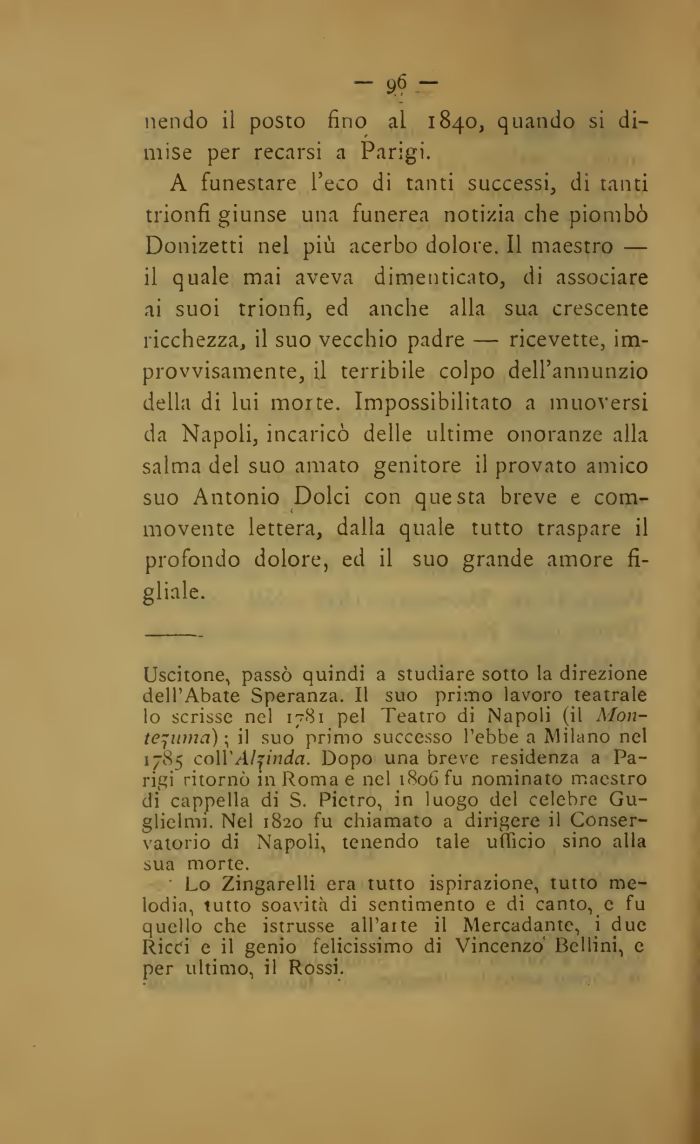 Lo Zingarelli era tutto ispirazione, tutto melodia, tutto soavità di sentimento e di canto, e fu quello che istrusse all'aite il Mercadante, i due Ricci e il genio felicissimo di Vincenzo Bellini, e per ultimo, il Rossi.