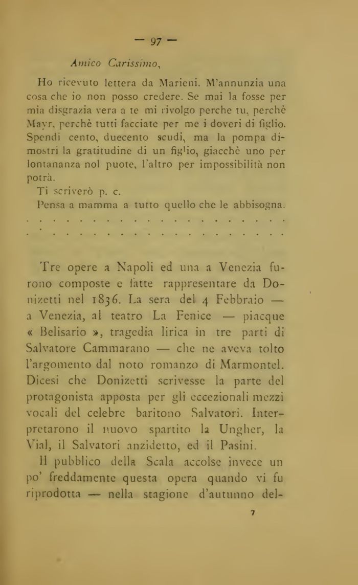 Tre opere a Napoli ed una a Venezia furono composte e fatte rappresentare da Donizetti nel 1836. La sera del 4 Febbraio — a Venezia, al teatro La Fenice — piacque « Belisario », tragedia lirica in tre parti di Salvatore Cammarano — che ne aveva tolto l'argomento dal noto romanzo di Marmontel. Dicesi che Donizetti scrivesse la parte del protagonista apposta per gli eccezionali mezzi vocali del celebre baritono Salvatori. Interpretarono il nuovo spartito la Ungher, la Vial, il Salvatori anzidetto, ed il Pasini.